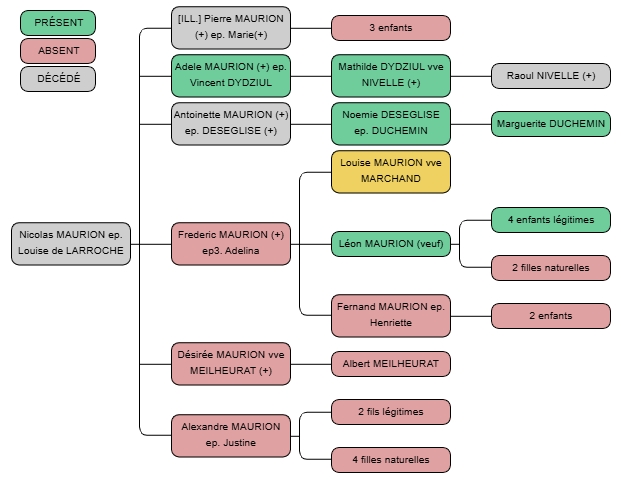 Reste un dernier nom à identifier sur notre faire-part, celui de Mauche. La piste à privilégier est celle de la proximité avec le nom Poyard, qui vient juste avant et qui doit désigner des cousins éloignés du défunt. Henry Marchand avait deux grands-oncles Poyard. On ne trouve aucun Mauche dans la descendance du premier, mais on en retrouve bien dans celle du second. Les noms Poyard et Mauche figurant sur le faire-part renvoient donc aux cousins issus de germain d’Henry Marchand : Adrien, Jules et Charles Poyard, ainsi que leur cousine Violette Levasseur, épouse Mauche.